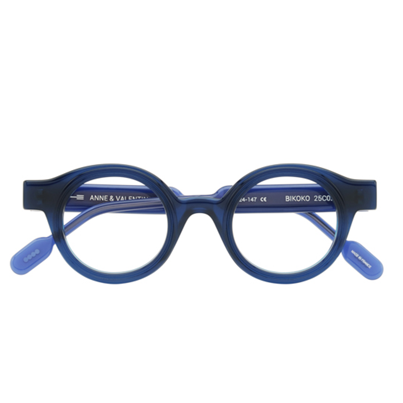 Anne et Valentin Bikoko 25C02 Blue este realizat din acetat premium într-o sublimă nuanță de albastru, ușor transparent.