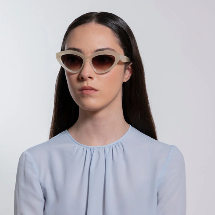 Lapima Camila Seda Gradient Sun: un design cat-eye în stil franțuzesc, realizat într-un mix cromatic cu totul unicat. Această pereche de ochelari realizată în Brazilia are ramele lucrate dintr-un acetat într-o nuanță de perlă, ușor translucidă, în timp ce lentile degrade creează doza perfectă de mister și eleganță.