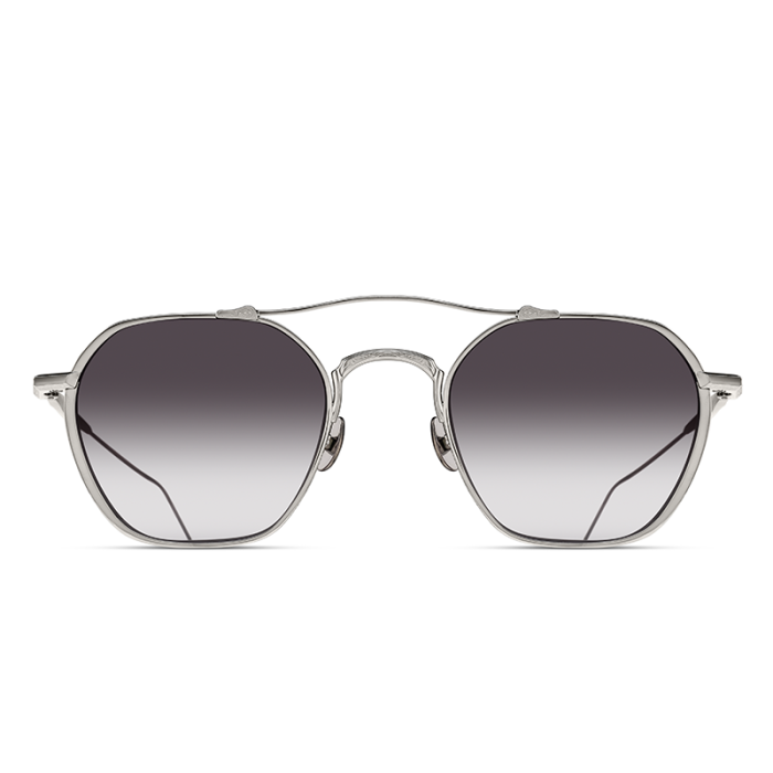 Modelul de ochelari Matsuda M3145 Palladium White Grey are o formă vintage de tip navigator, cu rame asimetrice unicat, tăiate din titan solid japonez. Acest design Matsuda are o punte nazală dublă, arcuită în partea superioară pentru un look retro-chic, în timp ce rama este asortată cu nuanțe emblematice, în degrade, ale lentilelor premium.
