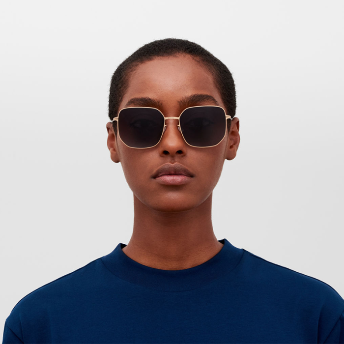 Ochelarii de soare Mykita Indira 318 Pow1 Champagne Gold au rame și brațe ultra-subțiri, realizate dintr-un oțel inoxidabil premium, oferind în același timp protecție 100% față de razele UVA/UVB prin lentilele degrade.
