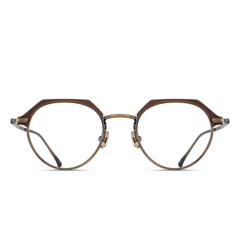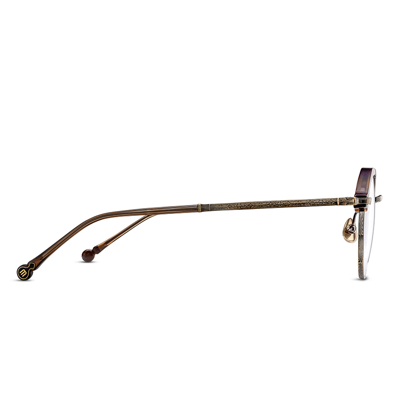 Modelul de ochelari Matsuda M2064 Matte Taupe Antique Gold este o ramă cu design panto, realizată din titan pur japonez în culori calde, pământii. Pe brațele se pot remarca ornamente de filigran în stil Art Nouveau, în timp ce ramele au decorațiuni în partea superioară lucrate artizanal din acetat japonez.