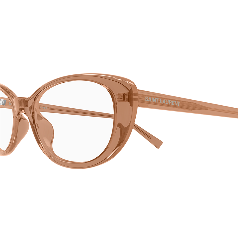 ochelari de vedere Saint Laurent SL822 OPT 008 Brown au un finisaj transparent, lucios, într-o nuanță caldă, ideală pentru un look stilat de sezon cald. Sunt ușori și se bucură de un design care a pășit deja în modă: forma ovală ergonomică, amintind de mijlocul anilor 2000.