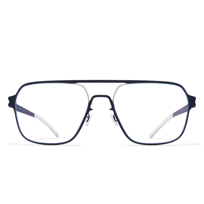 Un design Navigator ultra-subțire și fără șuruburi, reinterpretat: ochelarii de vedere Mykita Phil 271 Silver Indigo au rame cu o punte nazală unicat și sunt realizați integral la Berlin.